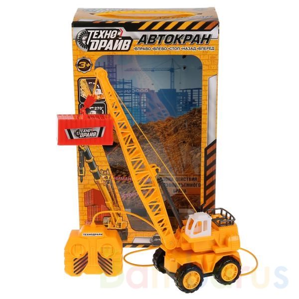 "Автокран" на дистанционном управлении ТМ "Техно Драйв" - это новая, уникальная игрушка для любой коллекции и самых интересных игр. Она выполнена из прочной пластмассы жёлтого цвета.С помощью пульта автокран может двигаться вперед и назад, а также поднимать и опускать стрелу. Кабина поворачивается на 270 градусов вручную. Игрушка развивает мелкую моторику, координацию и пространственное мышление. Для работы необходимо 3 батарейки типа АА. Рекомендуется детям от 3 лет.