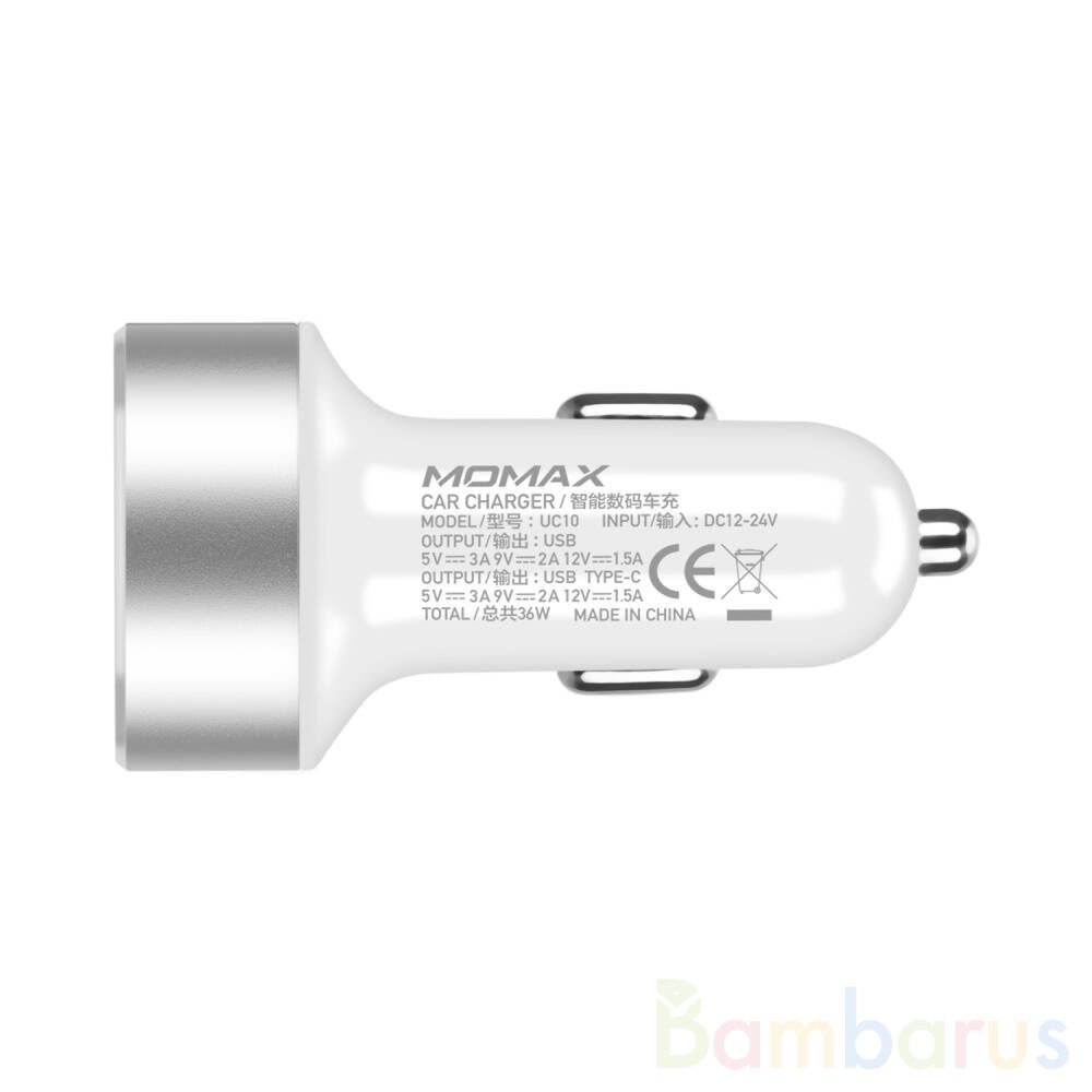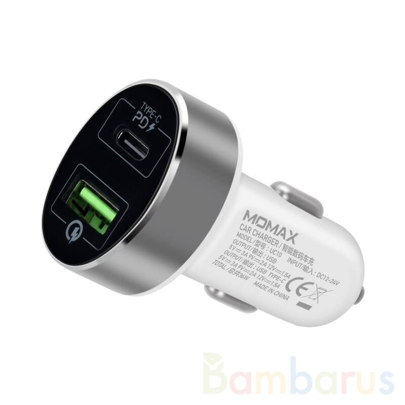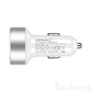 Автомобильное зарядное устройство Momax имеет интерфейс с двумя разъёмами: USB-C и USB-A.