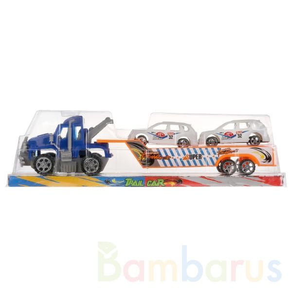 Сине-серая машина-автовоз перевозит машины поменьше. С такой яркой игрушкой ребёнку будет весело и интересно играть, можно как перевозить машинки на автовозе, так и играть с тремя машинками по отдельности.
