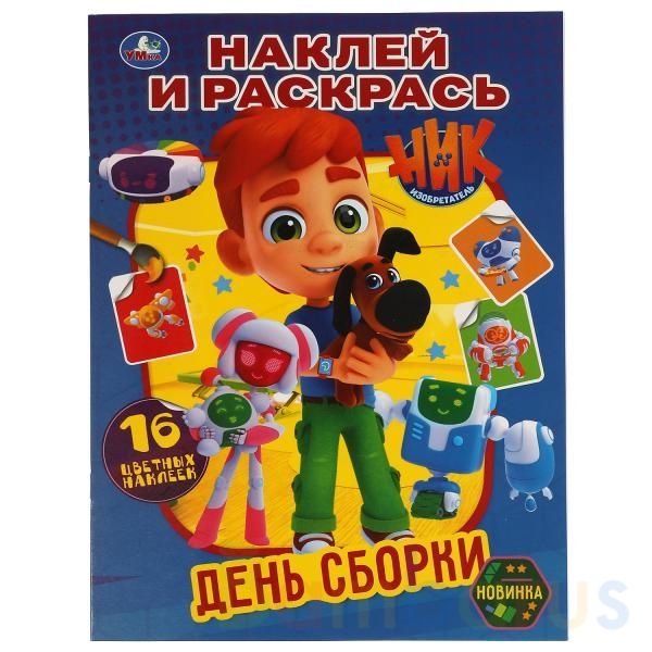 Раскраска с наклейками «Ник-изобретатель. День сборки» из серии «Наклей и раскрась» ТМ «УМка» станет отличным подарком для маленьких поклонников популярного мультсериала о талантливом мальчике-изобретателе и его роботах-помощниках: