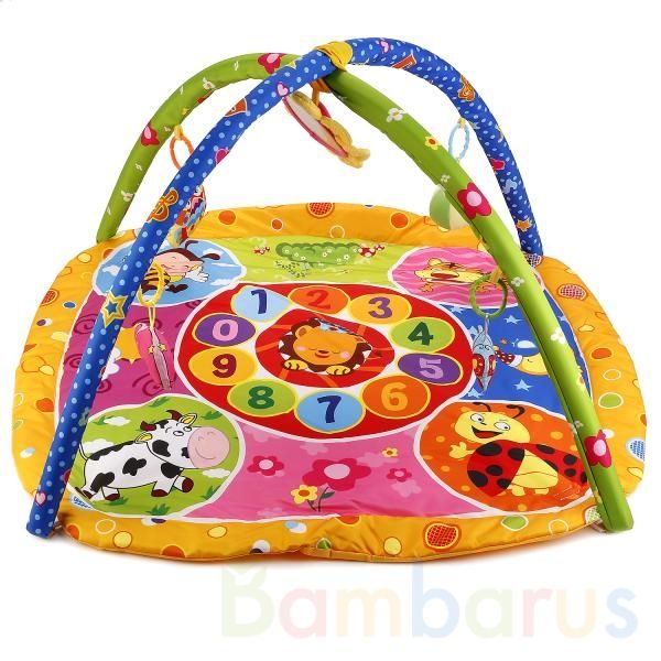 Коврик украшает весёлая картинка с животными и цифрами от 0 до 9. Игрушки крепятся к дугам, которые устанавливаются сверху. В комплект также входит удобная сумка, чтобы брать коврик с собой.