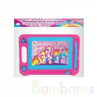 На магнитной доске с изображением волшебных единорогов рисовать ещё интереснее. Нарисованное можно без труда стереть специальным рычагом снизу - доска снова чистая и можно продолжать творить. Удобная ручка позволяет без труда переносить игрушку с места на место.