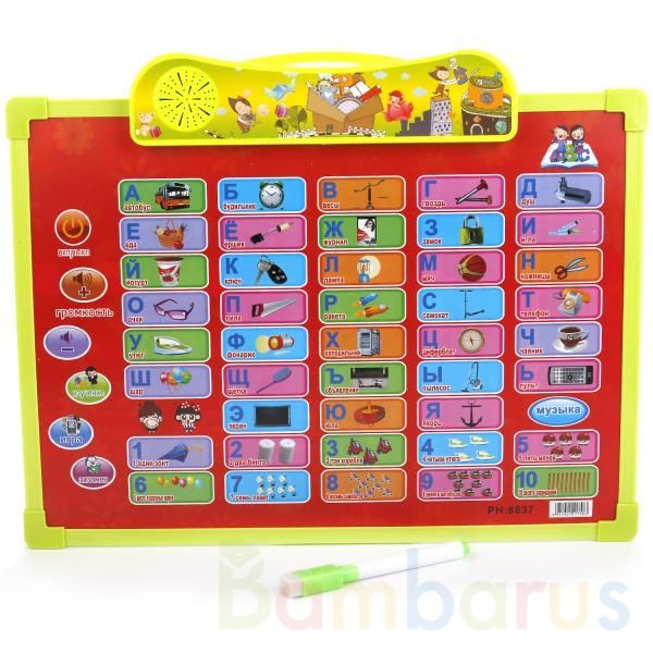 Доска для рисования является прекрасным обучающим материалом. На передней стороне изображены кнопки с цифрами, буквами алфавита и соответствующими картинками, переключения громкости, включения и выключения. Игрушка оснащается небольшим динамиком. При нажатии на кнопки ребёнок услышит различные звук…