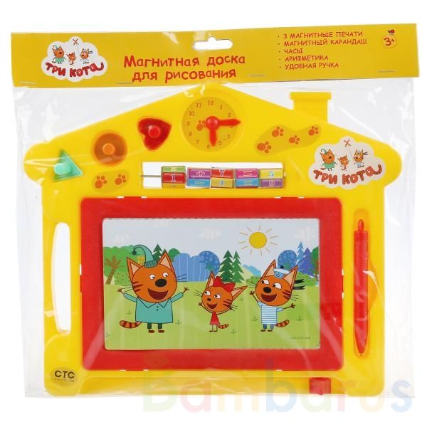 На красочной магнитной доске с изображениями любимых персонажей детей из мультфильма «Три кота» рисовать ещё интереснее. Специальный магнитный карандаш в комплекте не поцарапает поверхность и не испачкает руки. Если закончилось место, просто сотрите нарисованное специальным рычагом снизу. Доска снова чистая и можно продолжать творить. Над окошком для рисования располагаются яркие арифметические счёты с простыми арифметическими примерами, которые можно комбинировать. С помощью этой доски ребёнок будет не только развивать свои творческие способности, но и учиться считать и определять время. Удобная ручка сбоку позволяют брать досочку собой, чтобы развлечь ребенка во время поездки.