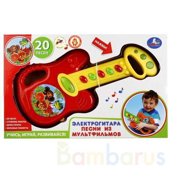 Детская электрогитара "УМКА" - это развивающая музыкальная игрушка, которая поможет раскрыть музыкальные способности ребёнка. Корпус выполнен из лёгкого пластика, гитару удобно держать детскими ручками. Игрушка имеет 2 режима работы - проигрывает песни и воспроизводит звуки гитары. Нажимая на разноцветные кнопочки, ребёнок сможет прослушать 20 песен из любимых мультфильмов. Подпевая им, малыш представит себя в роли настоящего гитариста, выступающего на сцене.