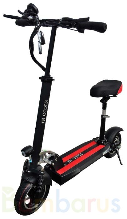 Электросамокат KUGOO M4 очень хорошо себя зарекомендовала. Сиденье идёт в комплекте с самокатом, и это большой плюс, ведь у многих электросамокатов оно приобретается отдельно. Самокат быстр и красив, его рама сделана из высокопрочного алюминия и имеет лёгкий вес. Рама складная, и это уже принято, что все модели от завода Kugoo имеют складную раму, это очень удобно при хранении и перемещении самоката. Самокат, как и предшественник, имеет амортизацию передней вилки, задние гидравлические амортизаторы и колёса 10 дюймов с толстой покрышкой и камерой, что немаловажно при эксплуатации самоката по пресечённой местности. Самокат оборудован яркой Led фарой, задним стоп-сигналом, указателями поворота и звуковым сигналом. Электросамокат очень комфортный и мягкий, с плавным ходом.