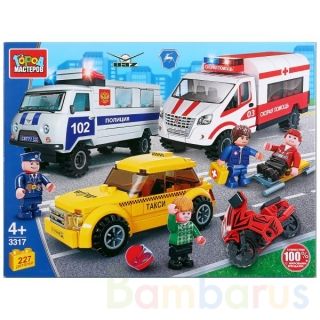 - В наборе: 4 фигурки (2 водителя + полицейский + врач скорой помощи) + 4 машины (полиция, скорая, такси, мотоцикл) + аксессуары (шлем мотоциклиста, чемоданчик врача);