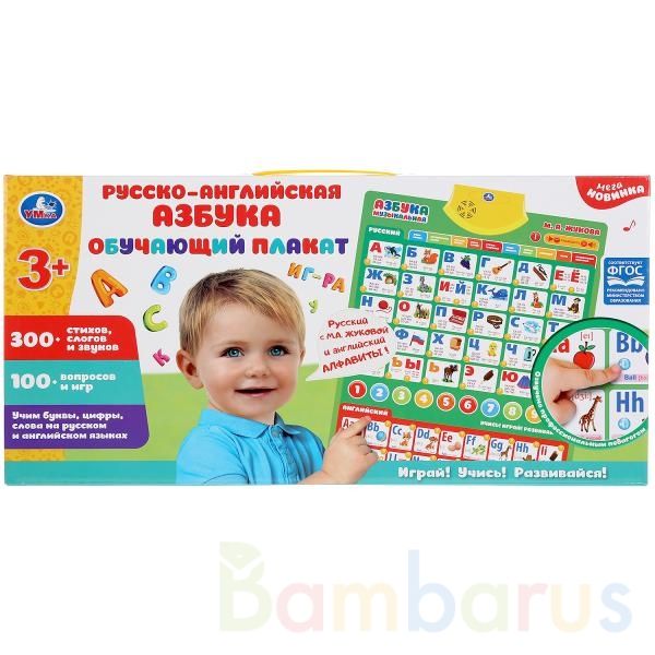 Обучающий плакат «Русско-английская азбука» ТМ «УМка»:- 300 стихов, слогов и звуков- 100 вопросов и игр- учим буквы, цифры, слова на русском и английском языках- 5 песен: «АБВГДЕЙКА», «ABC», «Учат в школе», «Old McDonald had a farm», «Дважды два четыре»- обучающие программы- кнопки регулировки гром…