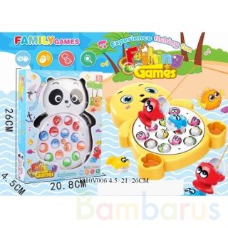 В «пруду» вертикально помещаются 15 ярких рыбок. При включении круглая подставка игрушки начинает вращаться, а рыбки открывать и закрывать ротики. Задача маленького рыбака - успеть поймать рыбок на «крючок» и поскорее вытащить. Процесс рыбной ловли сопровождается весёлой музыкой.