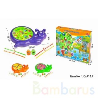Игра «Рыбалка» станет любимым занятием вашего малыша и подарит ему массу радостных эмоций.Комплектация:- пруд в форме улитки- 15 рыбок- 4 разноцветные удочкиВ «пруду» вертикально помещаются 15 ярких рыбок. При включении круглая подставка игрушки начинает вращаться, а рыбки открывать и закрывать рот…