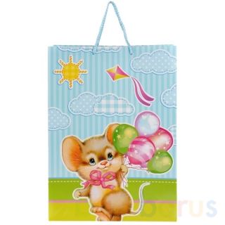 Красочный пакет с изображением мышки с шариками, идущая по солнечной полянке, принесёт ребенку радость предвкушения. Ему будет интересно заглянуть в него, чтобы узнать, что же приготовили родные или друзья на день рождения или на любой другой праздник.
