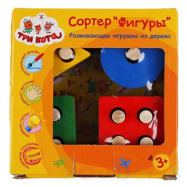 Сортируя яркие фигурки по сортеру «Три кота. Фигуры» знакомит ребёнка с разными фигурами, учит счёту, различать цвета, ориентироваться на плоскости и развивает: