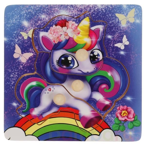 Малышу необходимо вставить вкладыши в специальные углубления на игровой основе так, чтобы сложилась картинка с изображением волшебного единорога. Яркая и интересная игра непременно увлечёт ребёнка, поможет ему увлекательно и с пользой провести время: он быстро и легко освоит такие понятия, как части и целое, научится сопоставлять формы.