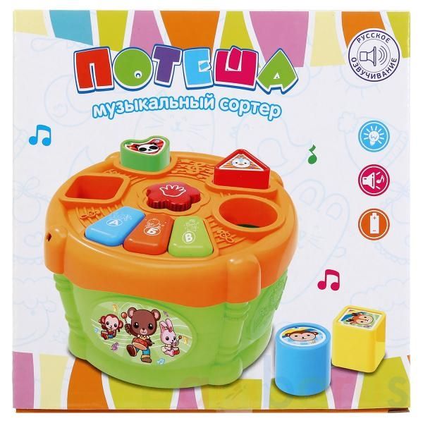 Музыкальный сортер «Потеша» – игрушка, которую полюбит каждый малыш!Функционал:- весёлая песенка (русское озвучивание)- подсветка- стихи- обучающие режимыВ наборе:- 4 фигурки для сортера разной формы и цветаЯркий барабан порадует ребёнка световыми, звуковыми эффектами и яркими цветами. В верхней ча…