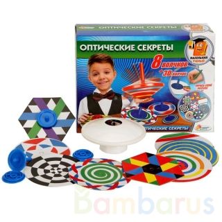 С этим занимательным набором ваш ребёнок почувствует себя настоящий иллюзионистом. В процессе игры он узнает много нового об оптических иллюзиях: что одни и те же предметы, в зависимости от цвета и окружающих их рисунков, могут казаться нам больше или меньше, плоские картинки – трёхмерными, а неподвижные – двигающимися.