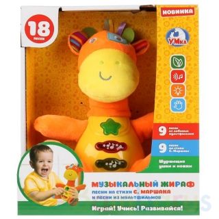 Плюшевая игрушка «Музыкальный жираф» – новинка ТМ «УМка» – привлечёт малыша яркими цветами, своей формой, весёлой мордочкой, радуя и развивая его. Функционал и комплектация очаровательного яркого жирафика приведут юного любознайку в восторг:- 9 песен на стихи С. Маршака из цикла «Детки в клетке»: «…