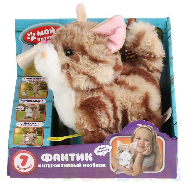 Интерактивный котёнок «Фантик» ТМ «Мой питомец»:- ходит- виляет хвостиком- двигает головой- пьёт из бутылочки (в комплекте) и причмокивает- мяукает- поёт песенку- реагирует на поглаживание по головеМаленькая очаровательная игрушка ищет своего юного хозяина. Котёнок Фантик будет рад поиграть с малыш…