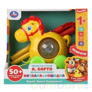 Вашего малыша приведёт в восторг эта игрушка в виде забавной лошадки. Он с удовольствием будет включать и слушать весёлые песенки и потешки. Кроме того, у лошадки есть колесики, и с ней можно играть как с каталкой - возить за верёвочку или за палочку.