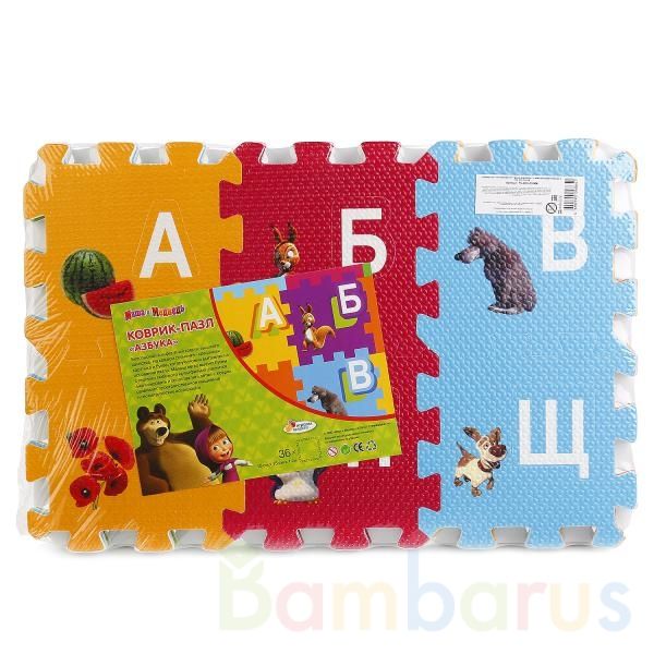 КОВРИК-ПАЗЛ "ИГРАЕМ ВМЕСТЕ" "МАША И МЕДВЕДЬ" С ВЫРЕЗАННЫМИ БУКВАМИ В ПАК. 45*5,5*30СМ в кор.24шт Коврик-пазл "Маша и Медведь" сделан не только для игры, но и для развития ребёнка. Он состоит из 36-ти ярких, больших сегментов, на каждом из которых вырезана цифра и изображены разные машинки из знаменитого мультфильма. Коврик будет служить мягкой площадкой для игр, полем для развития мелкой моторики, изучения букв, форм фигур и цветов. Он сделан из безопасного материала, не содержит токсичную краску. Размер составляет 45*5,5*30 см. Рекомендуется детям от 3-х лет.