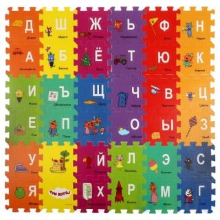 - Коврик состоит из 36 элементов крупного пазла с вырезанными буквами, которые вставляются в каждый сегмент;