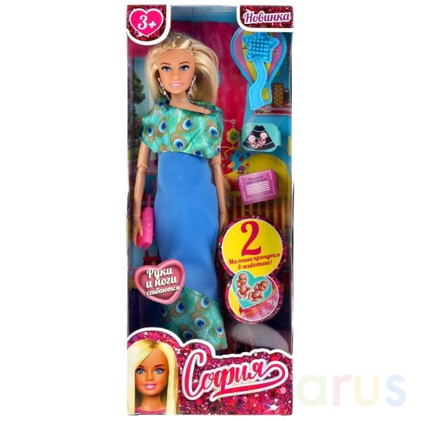 Будущая мама София одета в нарядное приталенное платье голубого цвета, декорированное пелериной с принтом – павлиньи перья. Образ куколки дополняют модные крупные серьги и элегантная сумочка. Одежду и аксессуары легко снять и надеть. С такой модной куклой девочке будет интересно и весело играть: благодаря тому, что руки и ноги куклы подвижны, им можно придать любое положение. У Софии длинные красивые волосы, которые хозяйка куклы сможет заплетать в разные причёски. Детально проработанный дизайн игрушки вдохновит девочку на новые игровые сюжеты.