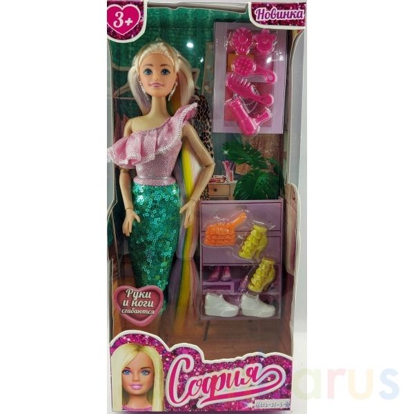 Модница София одета в нежно-розовый топ с оборкой из блестящего материала и изумрудную юбку-карандаш из переливающихся пайеток. Образ дополняют крупные серьги. Одежду и аксессуары легко снять и надеть. С такой модной куклой девочке будет интересно и весело играть: благодаря тому, что руки и ноги куклы подвижны, им можно придать любое положение. У Софии длинные красивые волосы, которые хозяйка куклы может заплетать в разные причёски. Детально проработанный дизайн игрушки вдохновит девочку на новые игровые сюжеты.