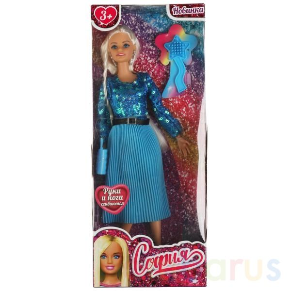 Модница-София одета в стильную кофточку из сверкающих пайеток и голубую юбку-гофре, образ дополнен изящными серьгами, широким поясом и сумочкой. С такой модной куклой девочке будет интересно и весело играть: благодаря тому, что руки и ноги куклы подвижны, им можно придать любое положение. У Софии длинные красивые волосы, которые хозяйка куклы сможет заплетать в разные причёски. Детально проработанный дизайн игрушки вдохновит девочку на новые игровые сюжеты.
