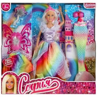 Прекрасная София одета в нарядное платье с пышной радужной юбкой. Образ куколки дополняют изящные серьги и корона. Одежду и аксессуары легко снять и надеть. Кроме того к Софии прилагаются наряды для образов феи и русалки. С такой модной куклой девочке будет интересно и весело играть: благодаря тому, что руки и ноги куклы подвижны, им можно придать любое положение. У Софии длинные красивые волосы, которые хозяйка куклы сможет заплетать в разные причёски. Детально проработанный дизайн игрушки вдохновит девочку на новые игровые сюжеты.