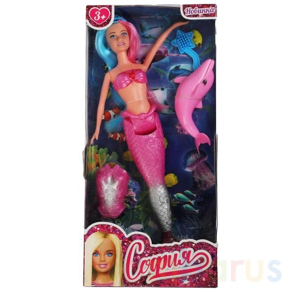 Прекрасная София одета в стильный розовый топ, как у настоящий русалки, у нее есть прекрасный розово-серебристый хвост. С такой куклой девочке будет интересно и весело играть. У Софии длинные красивые волосы, которые хозяйка куклы сможет заплетать в разные причёски. Детально проработанный дизайн игрушки вдохновит девочку на новые игровые сюжеты.