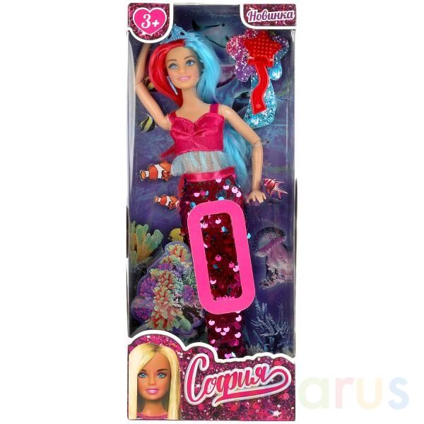 Прекрасная русалка София одета в розовый топ с блёстками и оборкой голубого цвета, а также голубые серьги и корону в тон. Её хвост цвета фуксии выполнен из ткани с пайетками и красиво переливается на свету. Одежду легко снять и надеть. С такой модной куклой девочке будет интересно и весело играть: благодаря тому, что руки и ноги куклы подвижны, им можно придать любое положение. У Софии длинные красивые волосы розового и голубого цветов, которые хозяйка куклы может заплетать в разные причёски. Детально проработанный дизайн игрушки вдохновит девочку на новые игровые сюжеты.