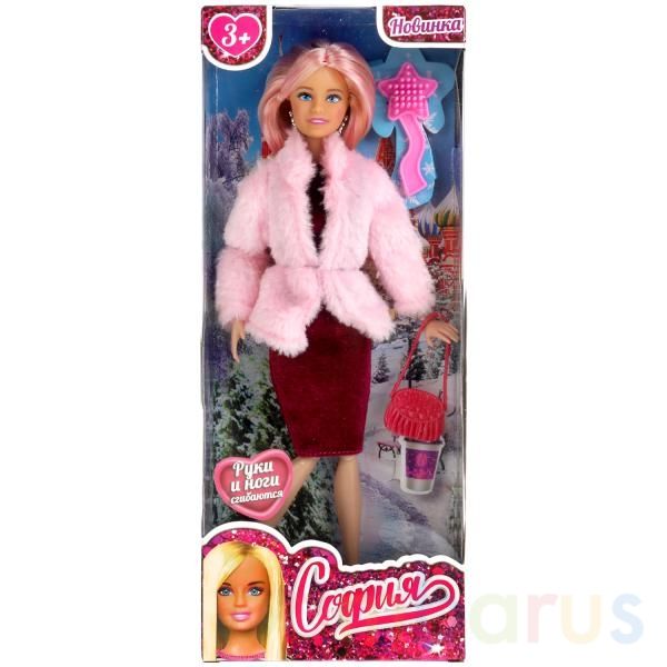 Модница-София одета в изящное бордовое платье и розовую шубку. Образ куколки дополняют стильные крупные серьги и элегантная сумочка. Одежду и аксессуары легко снять и надеть. С такой модной куклой девочке будет интересно и весело играть: благодаря тому, что руки и ноги куклы подвижны, им можно придать любое положение. У Софии длинные красивые волосы, которые хозяйка куклы сможет заплетать в разные причёски. Детально проработанный дизайн игрушки вдохновит девочку на новые игровые сюжеты.