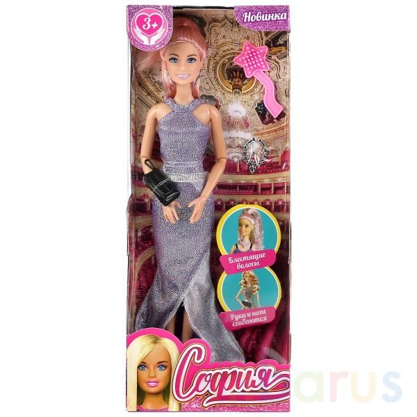 София одета в шикарное вечернее сиреневое платье из блестящей ткани. Ее образ дополняют модные фиолетовые туфли, изящные серьги и колье, а также элегантная сумочка. Одежду и аксессуары легко снять и надеть. С такой модной куклой девочке будет интересно и весело играть: благодаря тому, что руки и ноги куклы подвижны, им можно придать любое положение. У Софии длинные красивые волосы, которые хозяйка куклы сможет заплетать в разные причёски. Детально проработанный дизайн игрушки вдохновит девочку на новые игровые сюжеты.