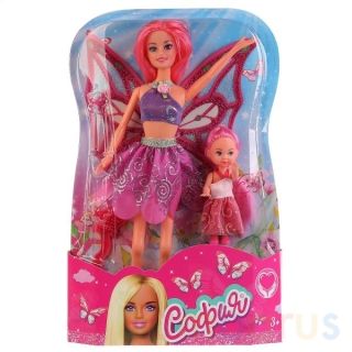 Куклы одеты в блестящие наряды. За спиной у Софии блестящие розовые крылья, как у бабочки. У обеих кукол длинные розовые волосы. Им можно сделать много красивых причёсок.