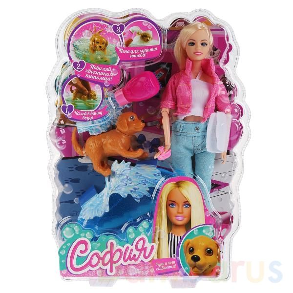Игровой набор ТМ «Карапуз» «София» с собакой виляющей хвостом.Функции:- питомец виляет хвостомАксессуары:- ванночка для питомца- мочалка- полотенцеНа Софии модная одежда: голубые джинсы, белый топ, розовая куртка и туфли (легко снять и одеть). Лицо куклы детально проработано. Руки и ноги куколки сг…