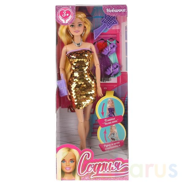 Очаровательная София одета в нарядное платье, украшенное золотистыми пайетками, цвет которых можно поменять, повернув их в другую сторону. Образ куколки дополняют стильные крупные серьги, элегантное колье и стильная сумочка-клатч. Одежду и аксессуары легко снять и надеть. С такой модной куклой девочке будет интересно и весело играть: благодаря тому, что руки и ноги куклы подвижны, им можно придать любое положение. У Софии длинные красивые волосы, их можно заплетать в разные причёски. Детально проработанный дизайн игрушки вдохновит девочку на новые игровые сюжеты.