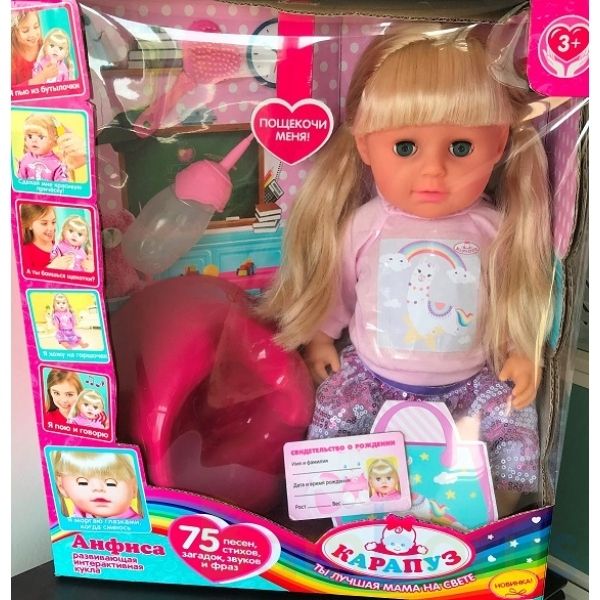 Развивающая интерактивная кукла «Анфиса» ТМ «Карапуз» станет прекрасным подарком для вашей маленькой принцессы:- поёт 9 песен: «Волшебный цветок», «Волшебный цветок», «Из чего же, из чего же», «Колыбельная Медведицы», «Мамочка», «Мир похож на цветной луг», «Настоящий друг», «Песенка Львёнка и Череп…