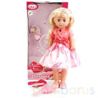 Интерактивная кукла с аксессуарами ТМ «Карапуз» - озвученная игрушка, которая поёт 2 песенки В.Шаинского и рассказывает 4 стиха Е.Благининой (нажмите кнопку на животике).
