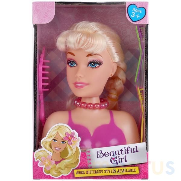 Кукла-манекен представляет собой кукольную голову из мягкого материала со светлыми длинными волосами. Кукольное лицо детально прорисовано, на фигуре нарисовано нежно-розовое платье, на шее изящный кулон на цепочке. С помощью этого набора можно создавать стильные причёски, украшая их аксессуарами на свой вкус. Все аксессуары малышка может использовать и для своей причёски.