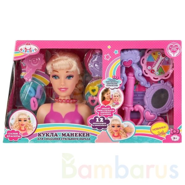 Кукла-манекен ТМ «Карапуз» для создания стильного образа - представляет собой кукольную голову из мягкого материала с длинными светлыми волосами. Кукольное лицо детально проработано.