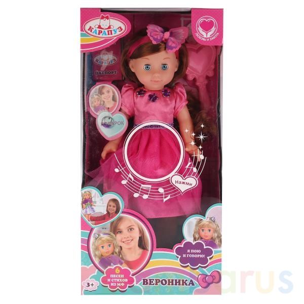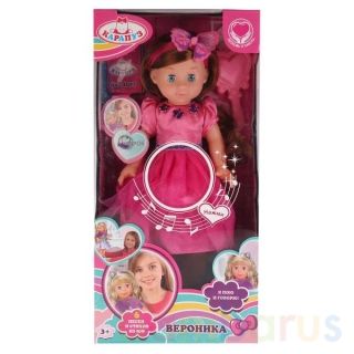 Интерактивная кукла «Вероника» с аксессуарами ТМ «Карапуз» - озвученная игрушка, которая поёт 2 песенки ("Когда мои друзья со мной", "Всё мы делим пополам") и читает 4 стиха из мультфильмов ("Подарок", "С добрым утром", "Посидим в тишине", "Простоквашино"). Нажмите кнопку на животике.