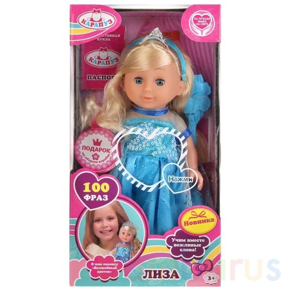 Развивающая интерактивная кукла «Лиза» ТМ «Карапуз» поёт песенку «Волшебный цветок», «АБВГДейка» и произносит 100 фраз (нажмите кнопку на животике):