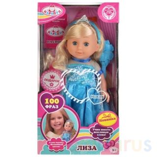 На Лизе: сверкающее бальное платье, корона и туфли (легко снять и надеть). Лицо куклы детально проработано. Длинные светлые волосы легко расчёсывать и создавать разнообразные причёски.