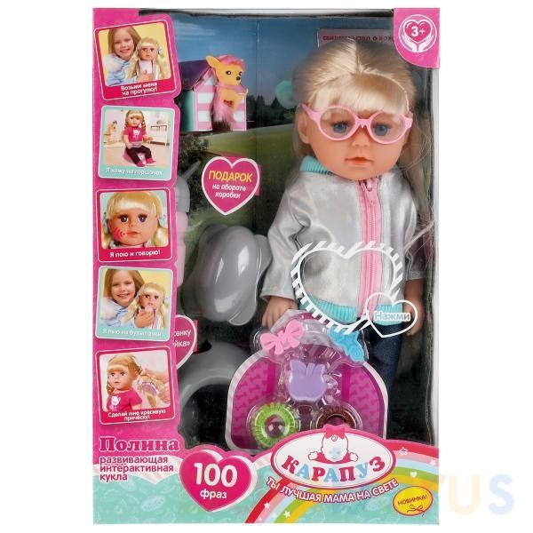 Милая кукла с детально проработанным личиком обязательно понравится малышке. Полина одета в серебристую курточку на молнии и джинсы, на ногах - голубенькие туфельки. Образ дополняют стильные очки в розовой оправе. Одежда и обувь легко снимаются и надеваются. У куклы длинные красивые волосы, которые можно расчёсывать и укладывать в разные причёски - для этого в наборе имеется расческа, резиночки и заколки. Кроме того, для более интересной игры в комплекте с куклой идёт милая собачка.