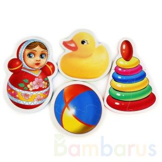 Задача ребёнка – правильно подобрать детали из набора, чтобы собрать пазлы с изображением детских игрушек. Благодаря небольшому количеству деталей, малыш без труда сможет выполнить задание, с каждым разом делая это всё быстрее и быстрее.