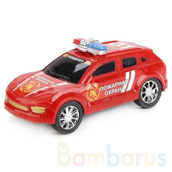 Машинка порадует маленького гонщика яркой расцветкой и скоростью, ведь она оснащена инерционным механизмом (если её потянуть назад и отпустить, то она начнёт двигаться вперёд). На крыше машины находятся мигалки и надписи "пожарная охрана" со всех сторон машины.