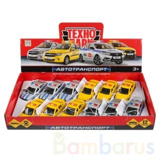 Металлическая модель «Автотранспорт» ТМ «Технопарк» - прекрасный подарок для ребёнка:- Lada Vesta/Lada Granta- полиция/такси- открываются двери- открывается багажник- инерционный механизм (поставьте машинку на ровную поверхность, потяните за корпус назад, отпустите и она начнёт быстро двигаться впе…