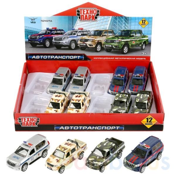 Металлическая инерционная модель ТМ «Технопарк» представлена в двух вариантах: «Toyota Prado» и «UAZ Pickup» из серий «Полиция» и «Война»