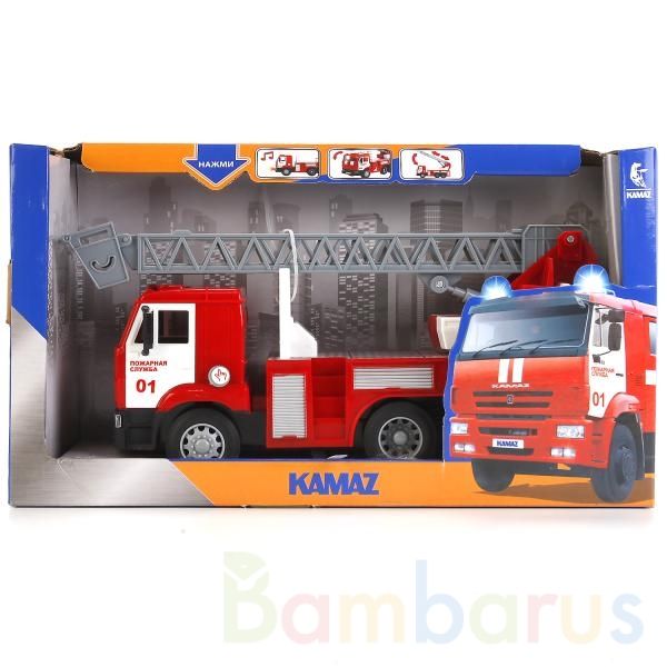 Пластиковая модель от компании "Технопарк" выполнена в виде Камаза в дизайне пожарной машины с лестницей. Кабина исполнена в ярком красном цвете, на дверях нанесены надписи «Пожарная служба 01». Игрушка порадует детей своей функциональностью: стрела машины поднимается и опускается, благодаря чему с…