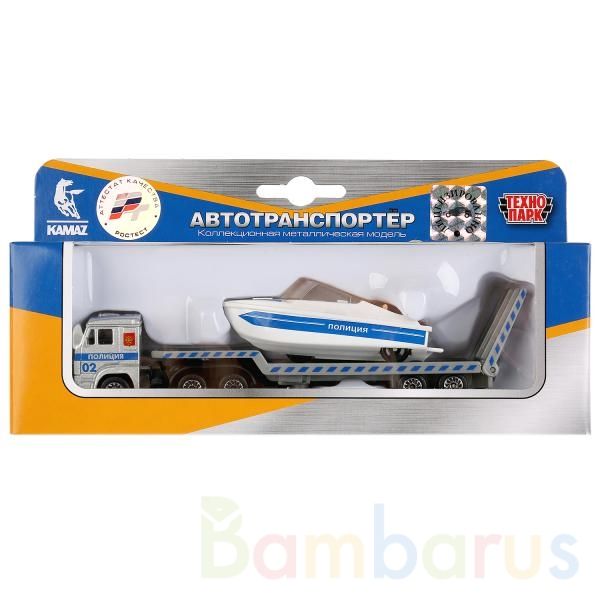 МАШИНА "ТЕХНОПАРК" МЕТАЛЛ. КАМАЗ ТРАНСПОРТЕР ПОЛИЦИЯ С ЛОДКОЙ В РУСС. КОР. в кор.2*72шт Прекрасный полицейский набор для подарка Вашему мальчику. В набор входит Камаз транспортер, точная копия настоящего, высоко дентализированная модель с кузовом, на котором стоит полицейская лодка размером 7,5 см. Камаз может первозить лодку куда угодно! Игра с набором совершенствует моторику рук и координацию движений ребёнка. Придумывая увлекательные сюжеты для игры, дети стимулируют свою фантазию и воображение. Рекомендовано детям от 3-х лет.
