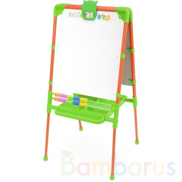 На белой металлической стороне удобно выкладывать первые слова из букв, а ещё составлять простые математические примеры и рисовать маркером. На чёрной пластиковой можно рисовать мелками красивые разноцветные картины или также писать слова и примеры. Под досочкой для рисования располагаются яркие счёты, которые помогут освоить основы математики.
